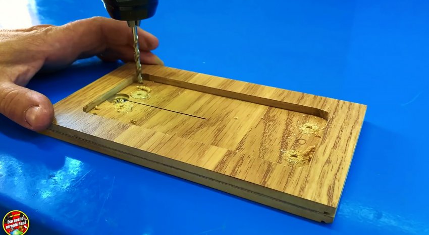 Полученную рамку укладываем на второй фрагмент, а в углубление помещаем подошву лобзика. Отмечаем продольную линию симметрии подошвы на сплошном фрагменте и положение центрального выступа. На отметке центрального выступа сверлим сквозное отверстие и от него вглубь сплошного фрагмента выполняем прорезь.