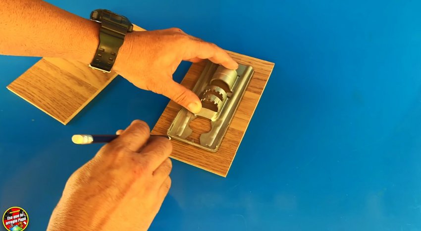 Открученную от корпуса лобзика подошву кладем на один из фрагментов ламината, обводим его по периметру маркером и вырезаем.