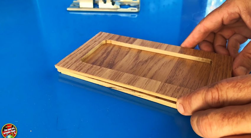 Высокоэффективным клеем приклеиваем рамку к второму фрагменту и, зафиксировав по периметру струбцинами, оставляем конструкцию до отвердевания клея. Периметр сдвоенных фрагментов шлифуем на наждачном станке.