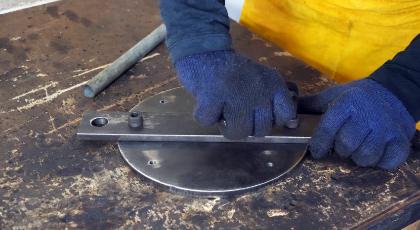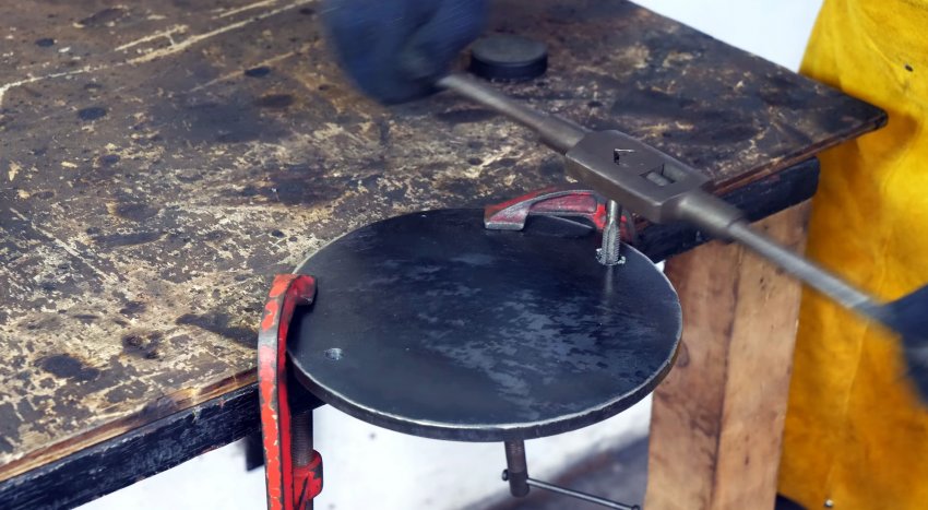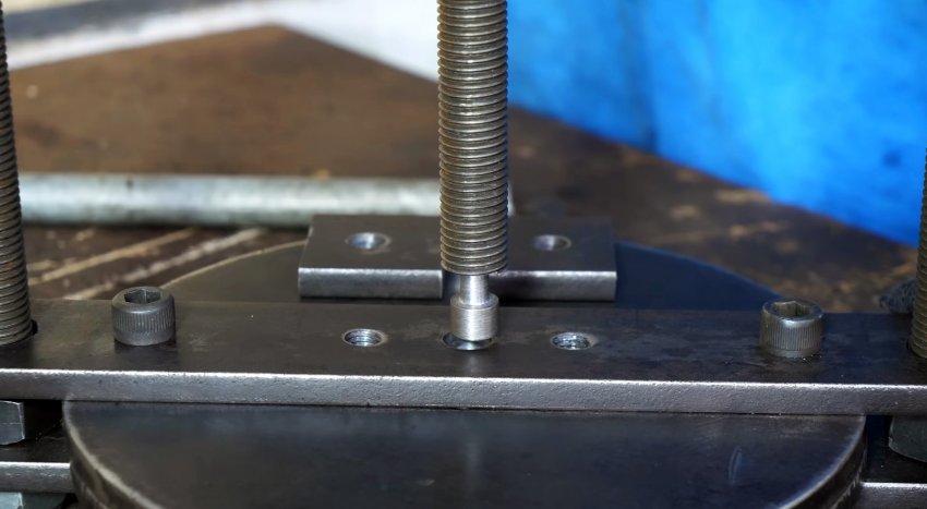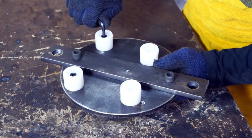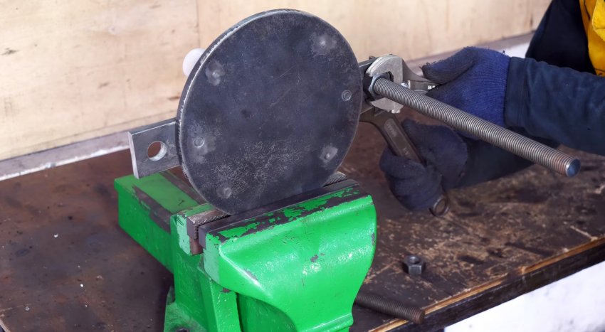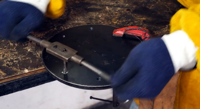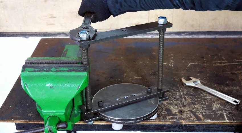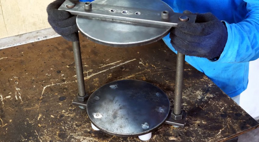 В первом диске необходимо просверлить 6 отверстий и нарезать в них резьбу. Из них 4 должны сформировать квадрат, чтобы установить в них ножки, и 2 делаются напротив для крепления механизма сжатия.
