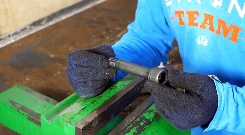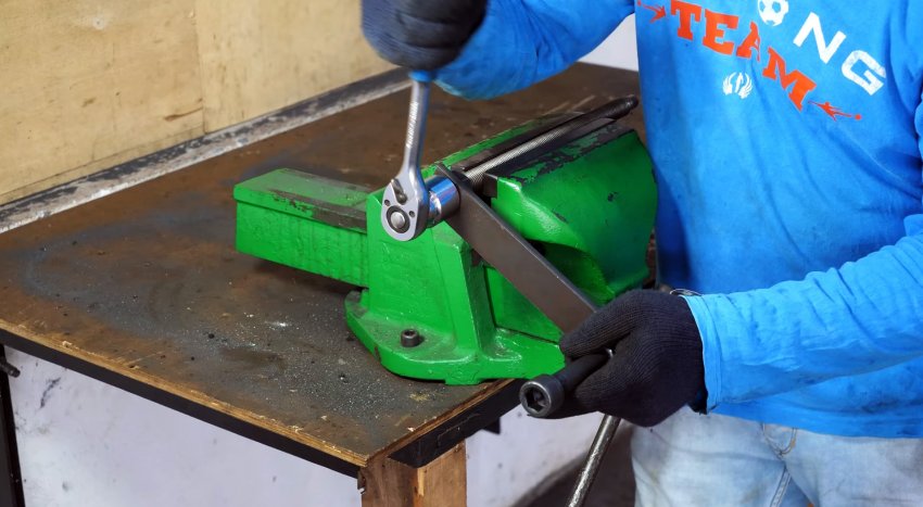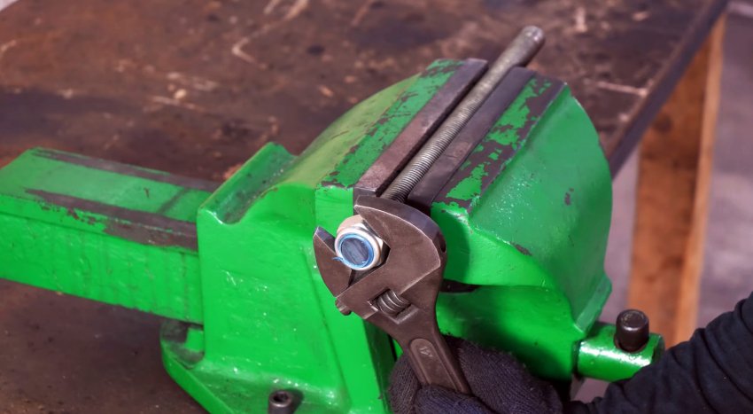 Для изготовления его ручки, нужно отрезать полосу, и просверлить по краям. В одном отверстии нарезается резьба. В него закручивается болт, который и послужит рукояткой. Затем ручка зажимается на краю винта.