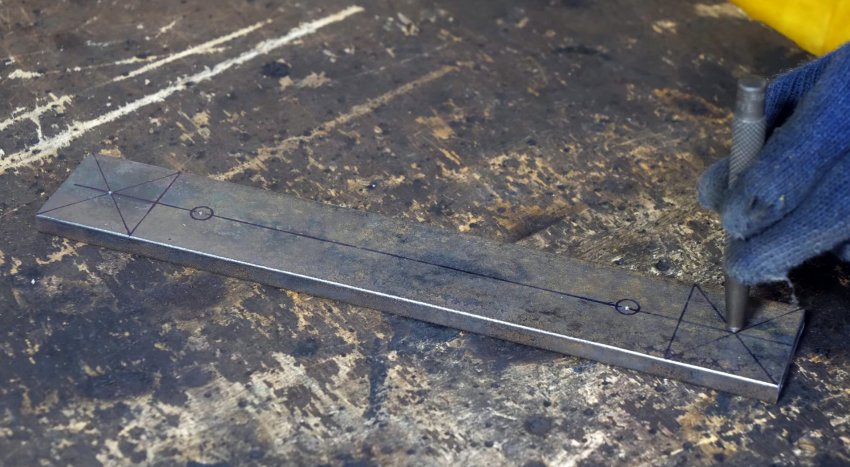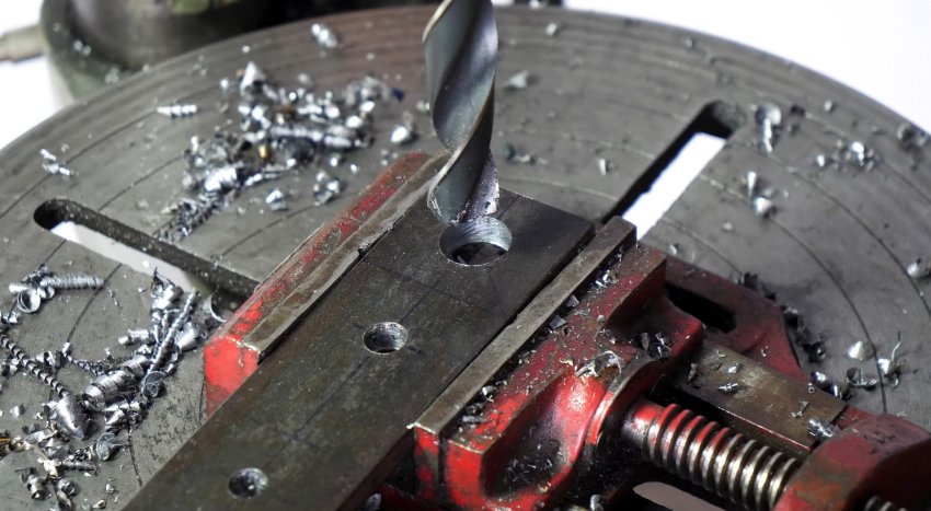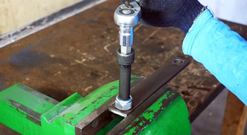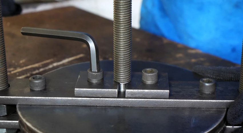 Из полосы вырезается третья аналогичная заготовка. По краям в ней сверлятся отверстия под шпильки. Также просвечивается отверстие по центру под прижимной винт. В нем нарезается резьба. Полосу нужно зажать наверху шпилек гайками.