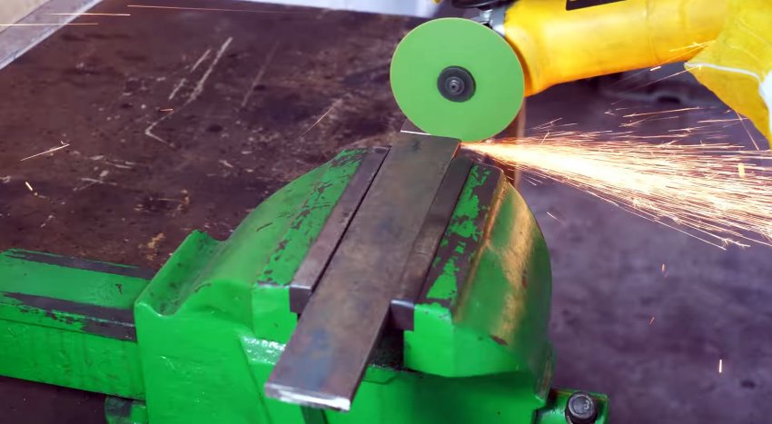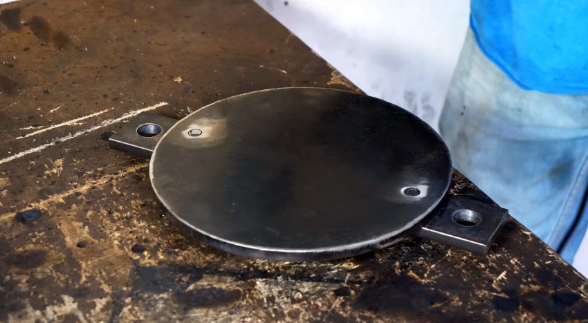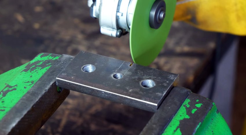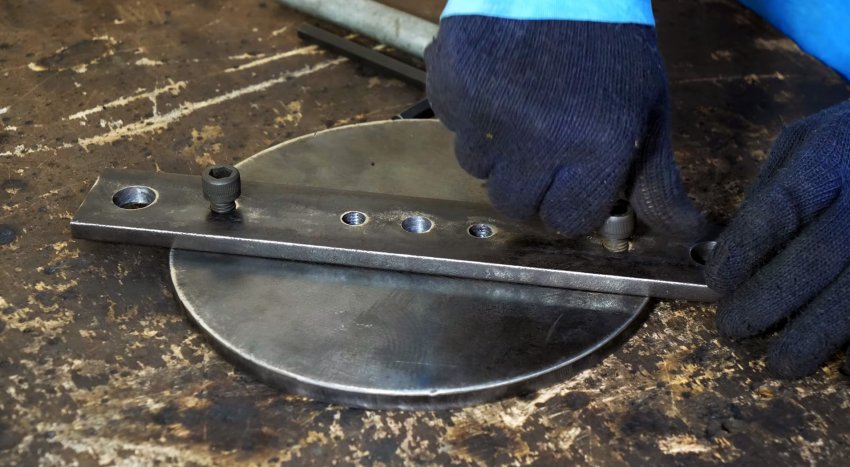 Из полосы отрезается заготовка на 10 см длиннее диаметра диска. В ней просверливается 4 отверстия. Из них 2 больших делаются по краям, а 2 должны совпасть с отверстиями для крепления в диске. В последних нарезается резьба.