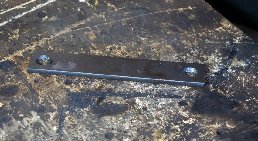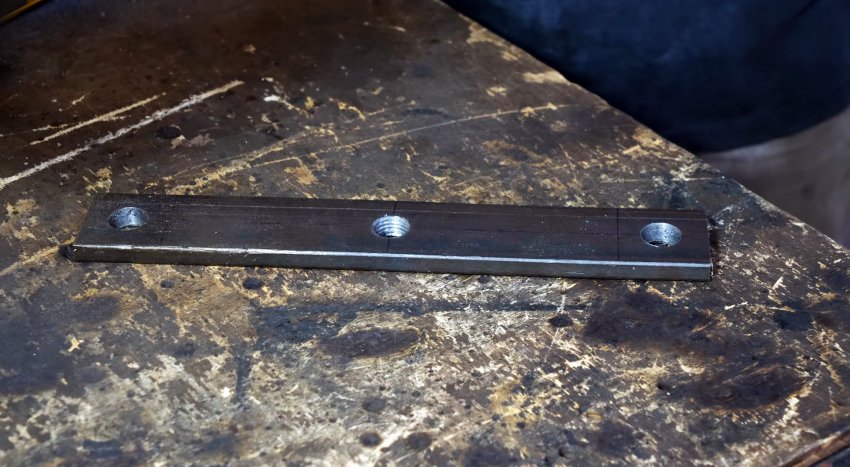 Затем вырезается такая же заготовка из полосы. В ней необходимо проделать аналогичные отверстия. Кроме них, нужно еще просверлить заготовку в центре, и сделать по отверстию с отступом 20 мм в обе стороны. Во всех отверстиях, кроме крайних для шпилек и центрального нарезается резьба.