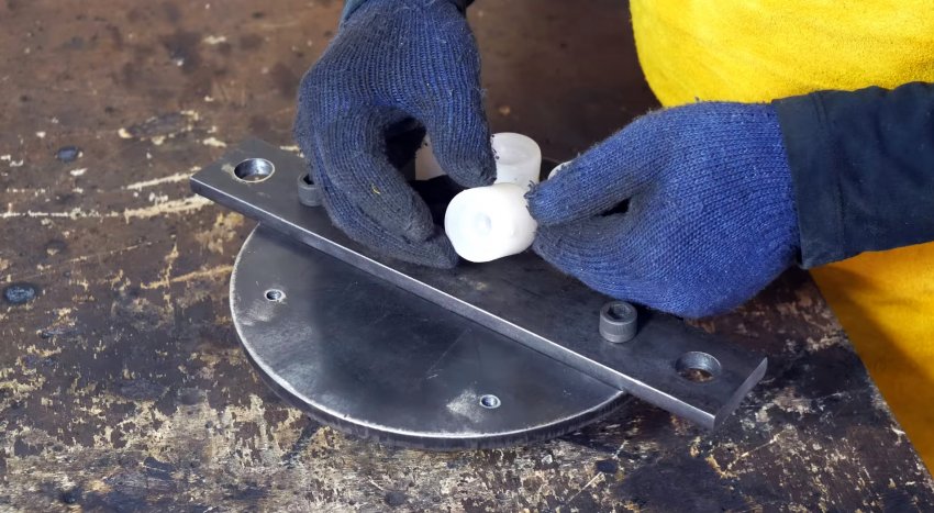 Чтобы его соединить с верхним диском, нужно сделать стопор из отрезка полосы. В нем просверливается 2 отверстия, чтобы прикручивать к полосе верхнего диска. Также делается центральное отверстие с прорезью, чтобы фиксировать стопор на проточке винта. После этого деталь прикручивается на место.
