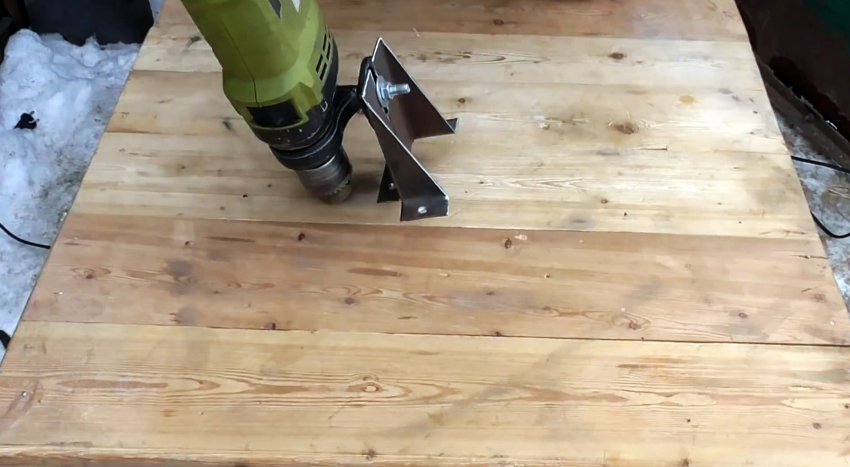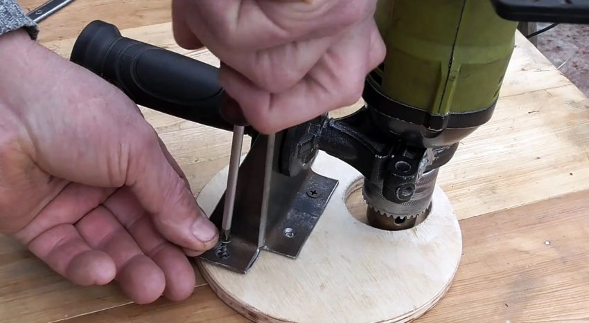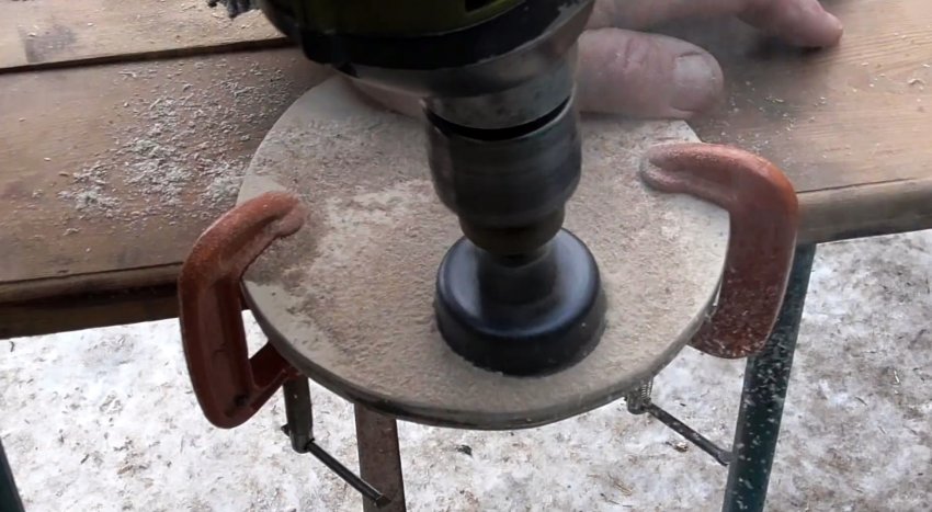 Устанавливаем дрель с силовым кронштейном на круг из многослойной фанеры и намечаем место сверления отверстия для патрона дрели с инструментом.