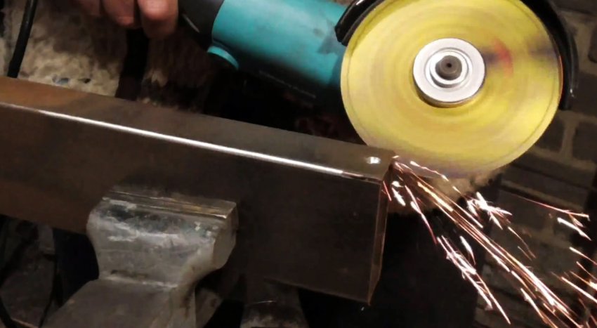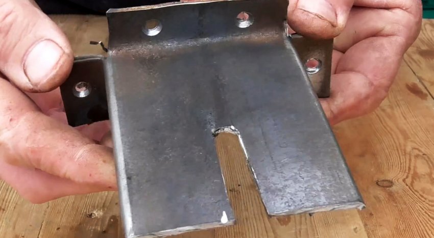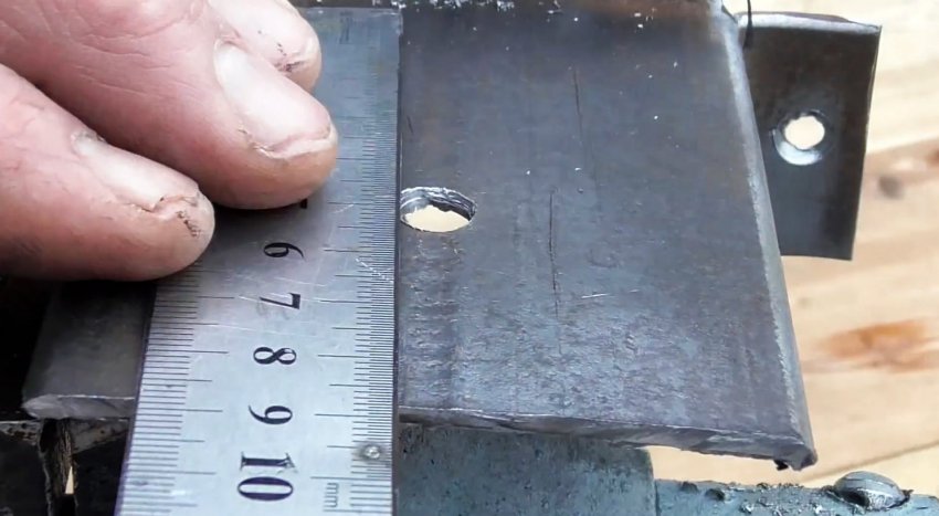 По намеченным линиям отрезаем фрагмент профильной прямоугольной трубы. В центре широкой стороны этого фрагмента, ближе к свободному краю, намечаем и сверлим отверстие. Выполняем продольную прорезь от отверстия до конца широкой стороны фрагмента прямоугольной трубы шириной, равной диаметру отверстия.