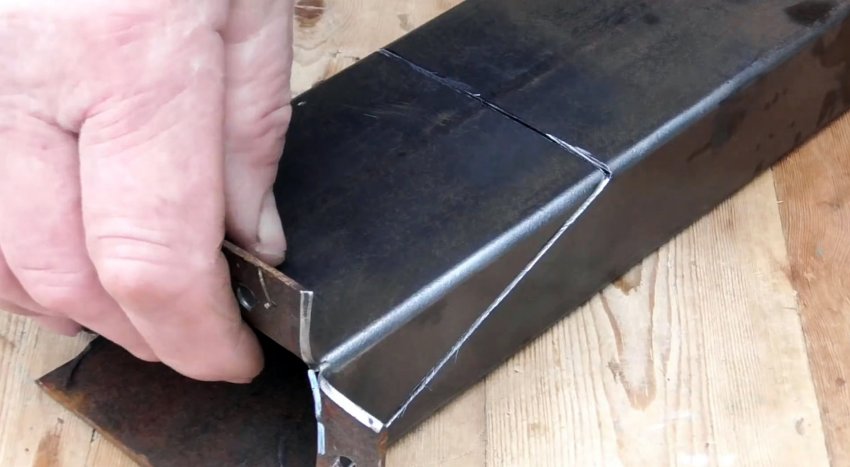 На широкой стороне с отогнутым краем и двумя отверстиями, проводим линию реза, параллельную торцу трубы. На узких сторонах трубы от концов проведенной линии проводим диагонали до углов отбортованных сторон.