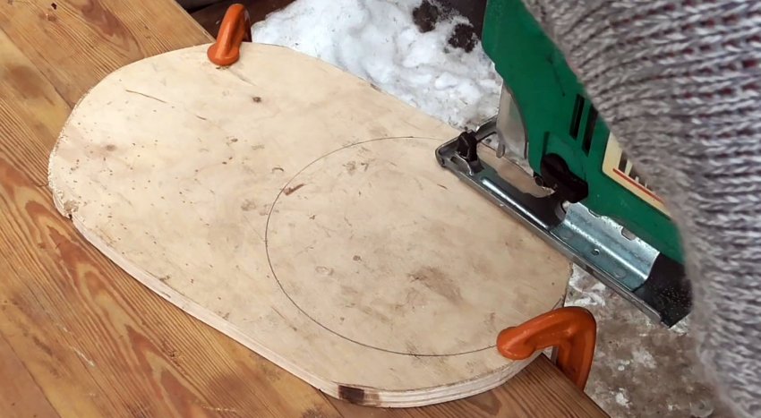 Выпиливаем из остатков многослойной фанеры с помощью ручной лобзиковой пилы круг заданного диаметра.