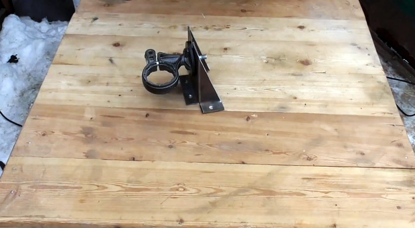 После выполнения отверстия с помощью корончатого сверла и соответствующей центровки дрели крепим силовой кронштейн из профильной прямоугольной трубы с отбортованными краями к кругу из многослойной фанеры посредством шурупов.