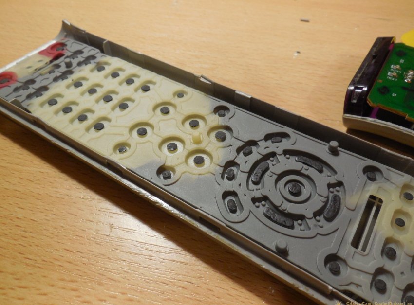 Теперь на одной половинке корпуса осталась плата, а на второй – сама «клавиатура» с токопроводящими контактами, можно наглядно увидеть, как при нажатии замыкаются те или иные пятачки на плате. На данном этапе можно протереть спиртовым раствором поверхность платы – порой клавиши плохо срабатывают из-за того, что она покрывается пылью или налётом грязи.