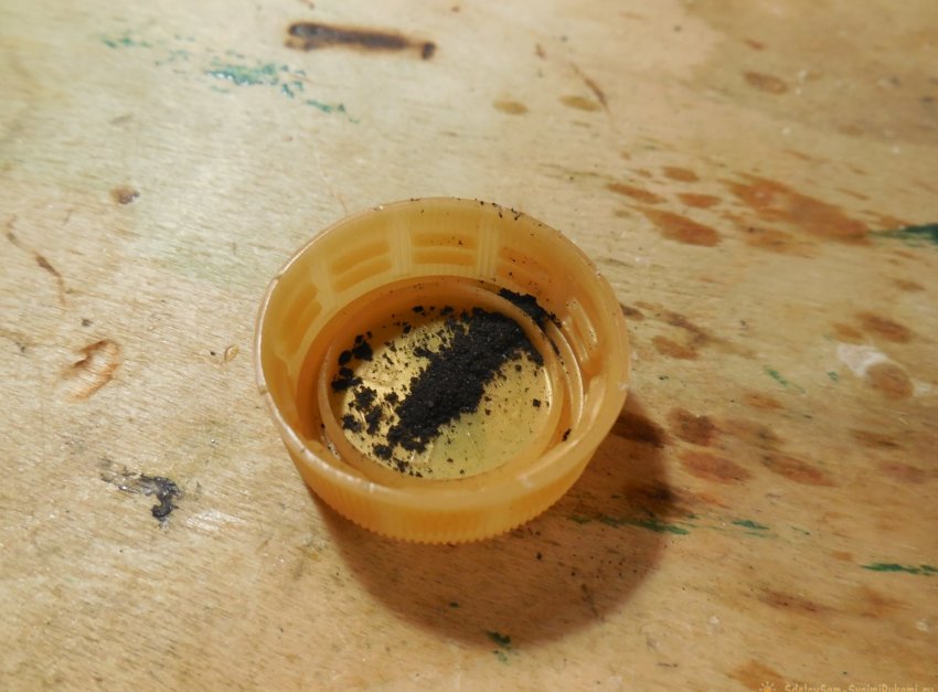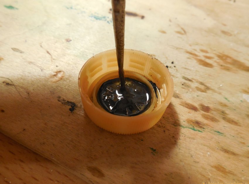 Лака нужно совсем чуть-чуть, буквально 1-2 капли, смешать его с порошком грифеля можно в крышечке от бутылки. Раствор желательно делать густым и насыщенным порошком, чтобы он обладал хорошей токопроводностью. К слову, вместо цапон-лака можно применить и другие лаки, какие найдутся под рукой.