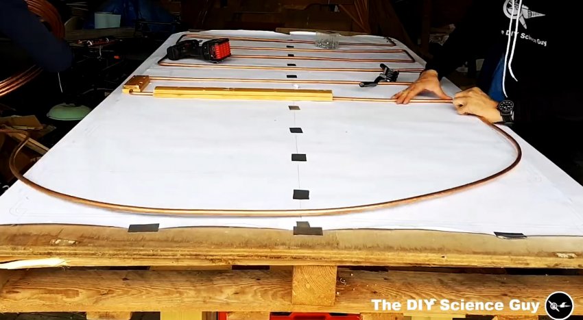 Теперь нужно выгнуть медную трубу. Витки выгибаются отталкиваясь от размера заготовленных ребер. Это лучше делать на листе ДСП, фанеры или OSB. Наносим разметку и аккуратно гнем, не допуская сильного дульного сужения. Чтобы трубка гнулась ровно, и не болталась, прижимаем рейкой с фрезерованным пазом. Такие шаблоны можно прикручивать к основанию.