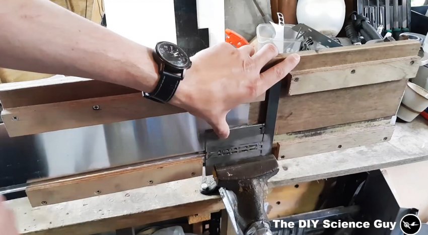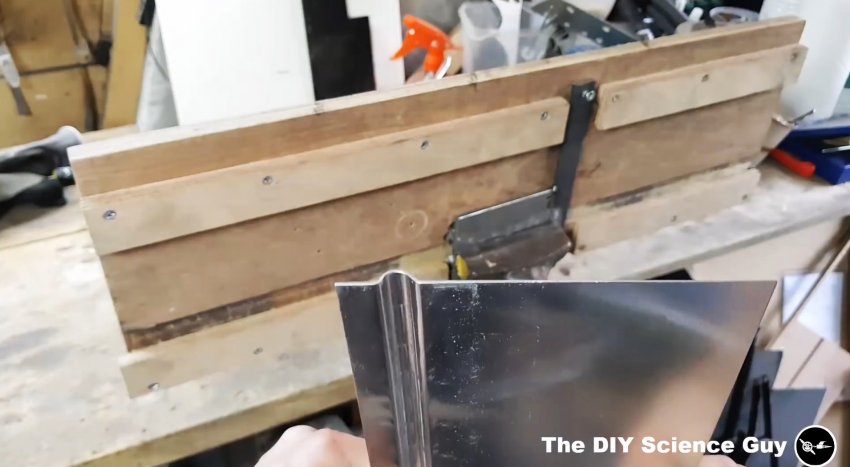 Для изготовления ребер нужно собрать из фанеры или доски кондуктор. Он представляет собой плоскость с ограничителями по ширине полосы, чтобы ее фиксировать и протягивать строго параллельно. На ней фрезеруется паз, в который будет вдавливаться заготовка. Кондуктор фиксируется на тиски.