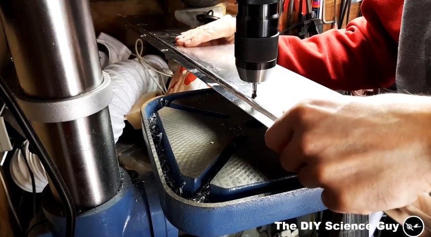 Далее нужно совместить 2 ребра, и просверлить их под заклепки. Это можно делать на колене, или же собрать еще один кондуктор. Тот представляет собой 2 доски с пазами, и прутком для вставки вместо трубки.