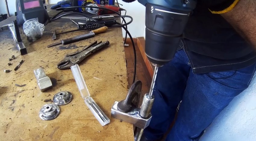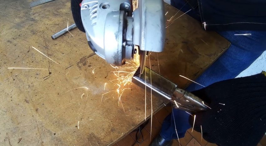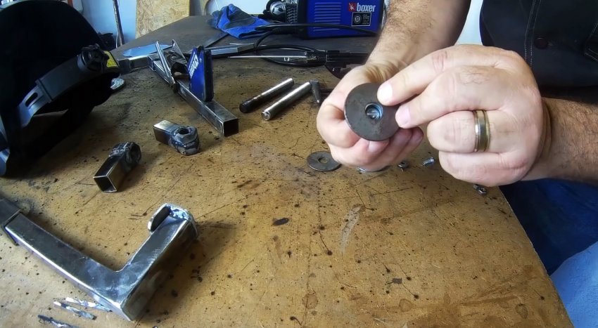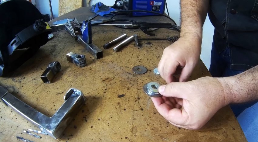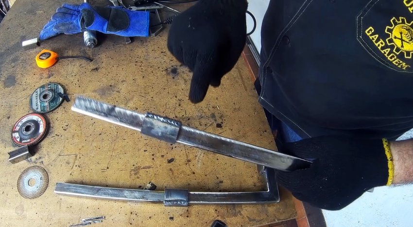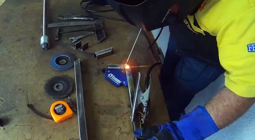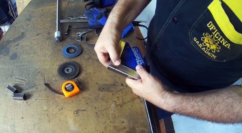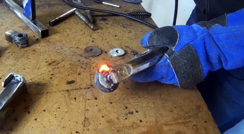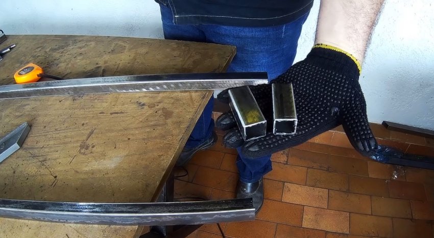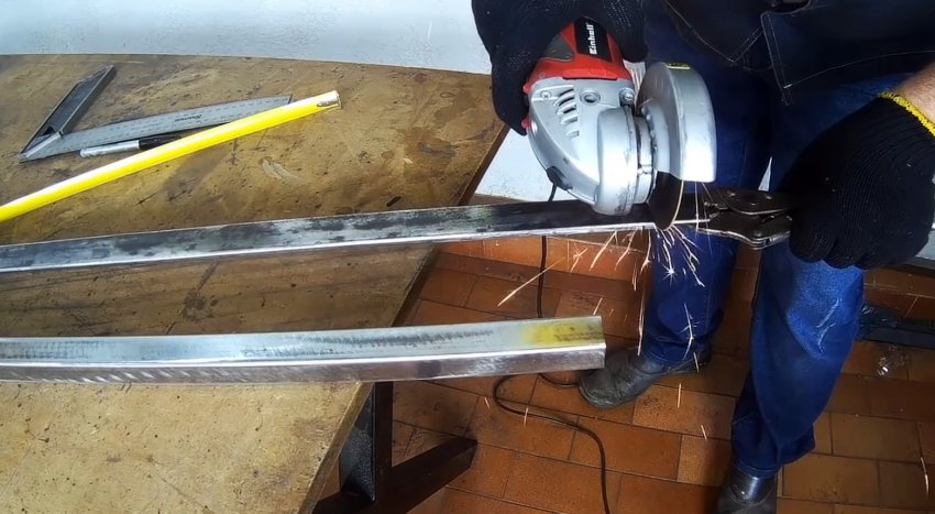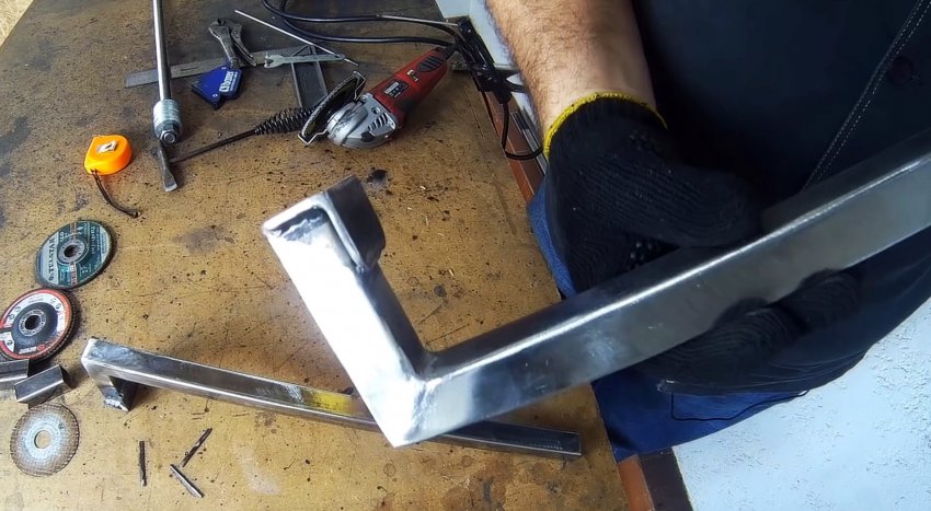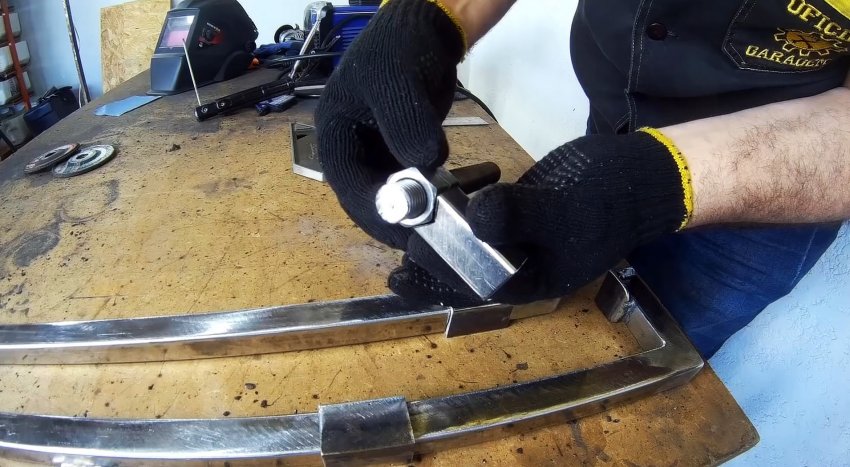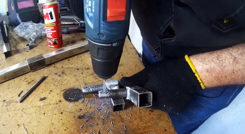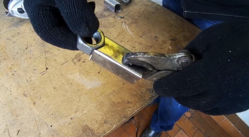 На заготовку с профильной трубы с запилом внутрь нужно приварить 2 гайки, накрученные на шпильку, чтобы их шаг резьбы совпадал. Полученный шов зачищается.