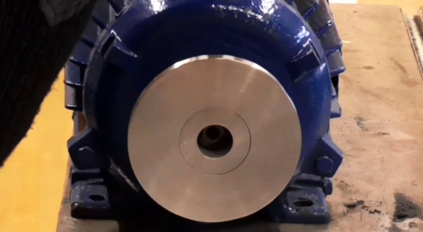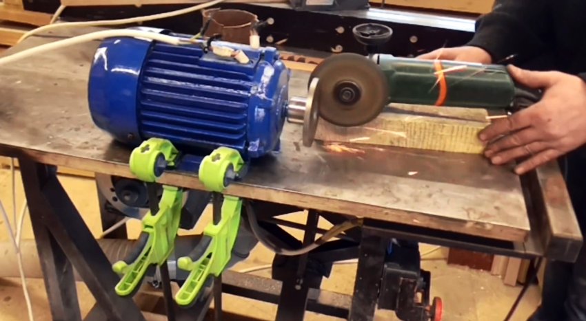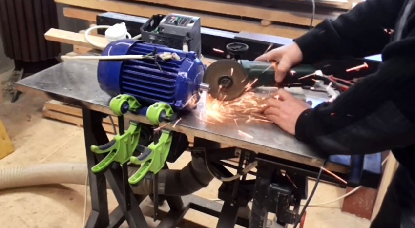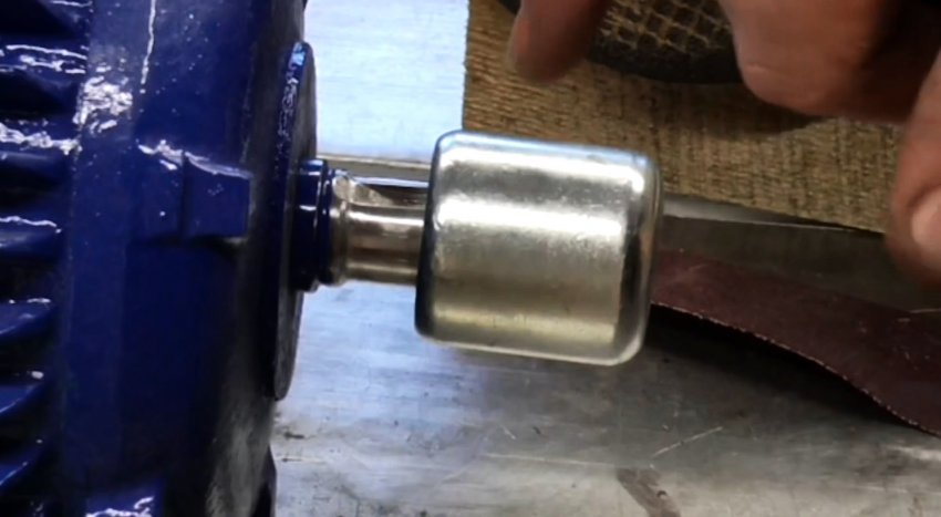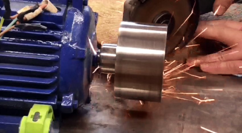 Включаем электродвигатель и болгарку, при этом вал мотора и диск инструмента должны вращаться навстречу друг другу. Слегка прижимая диск к валу, совершаем болгаркой возвратно-поступательные движения вдоль вала. В результате будет происходить съем металла, т. е. обточка вала. Шлифовку выполняем наждачной бумагой.