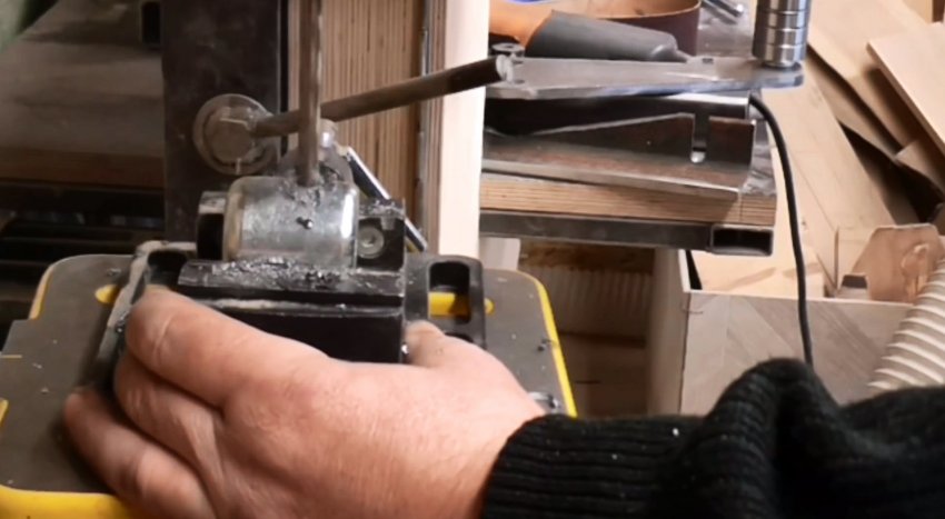 Поскольку внутренний диаметр втулки на 2 мм меньше диаметра вала, его нужно проточить. Для этого используем болгарку, прочно и жестко закрепленную к массивной деревянной доске с помощью болта.