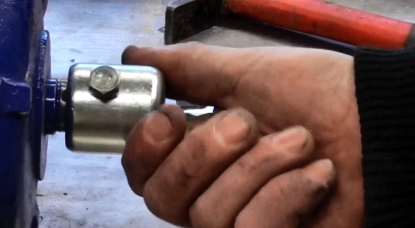 Во втулке сверлим поперечное отверстие, нарезаем с помощью дрели и метчика резьбу и вкручиваем стопорный болт до упора в вал.