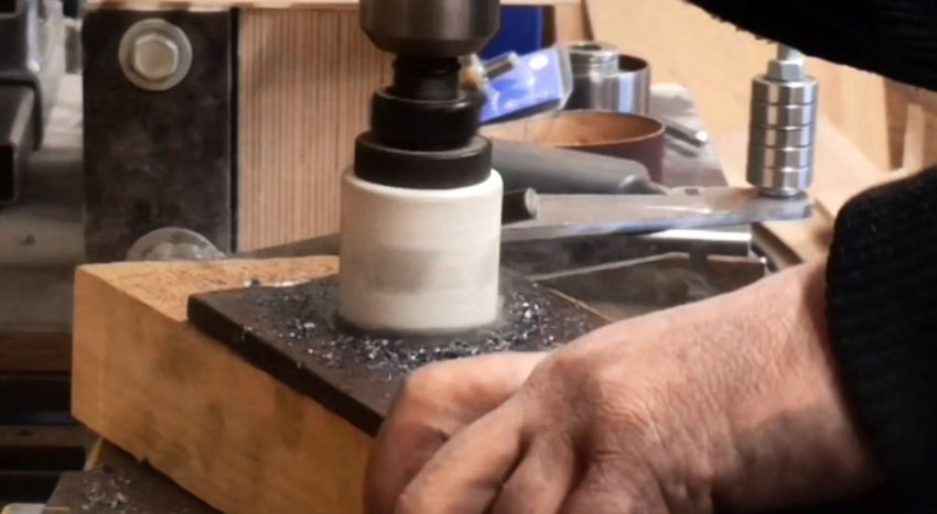 Поскольку конец втулки закругленный, подвергаем его торцовке той же болгаркой и шлифуем наждачкой, закрепленной на плоском держателе.