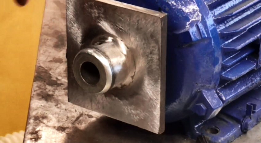 Перемещаем квадрат отверстием по втулке, пока его наружная плоскость не совпадет с внешним торцом втулки и привариваем там с помощью сварки.