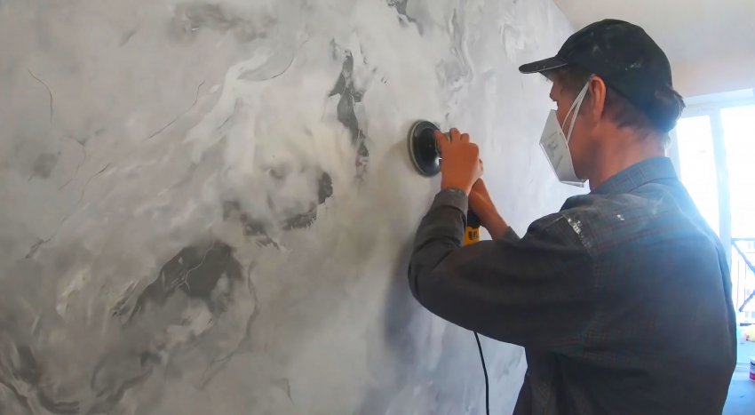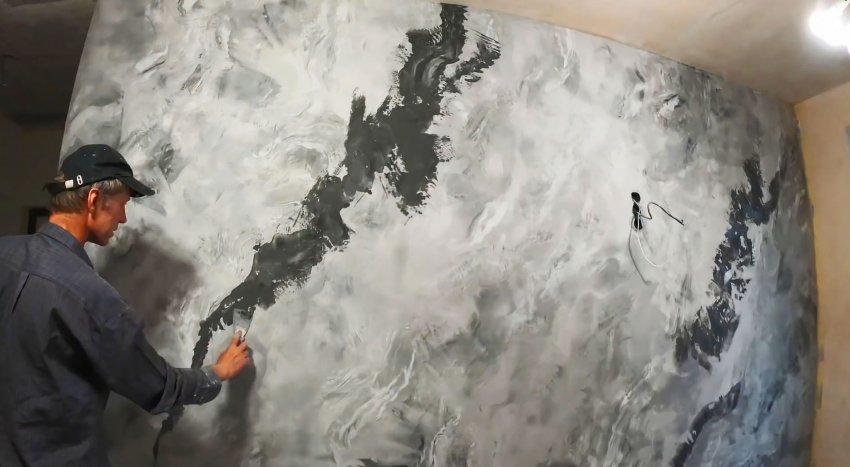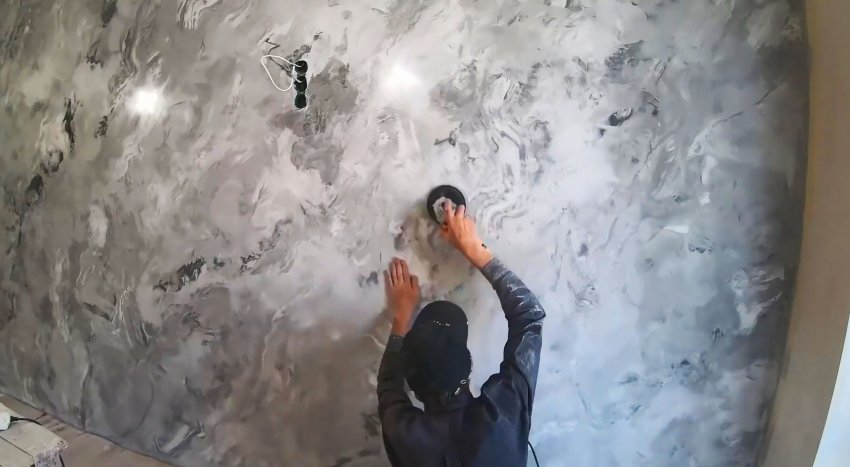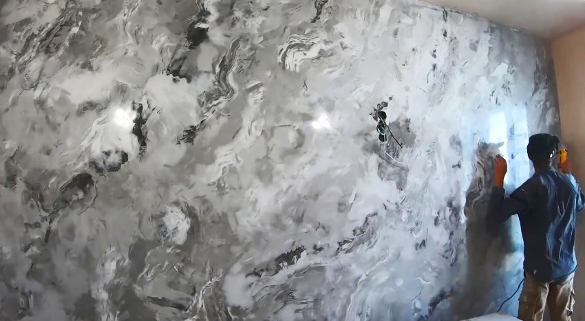 На отполированной стене можно используя тонкую художественную кисть нарисовать прожилки. Для этого используется белая краска с черным колером. Можно также развести в воде штукатурку и подкрасить ее пигментом, будет такой же результат.