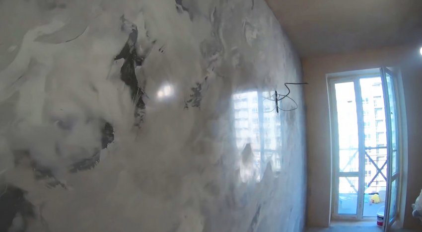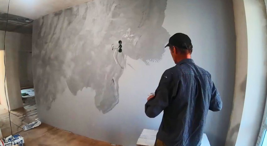 Таким способом штукатурится вся стена тончайшим слоем. Это даже не оштукатуривание, а как бы закрашивание.