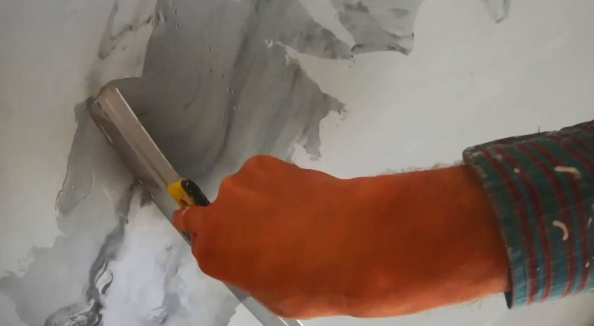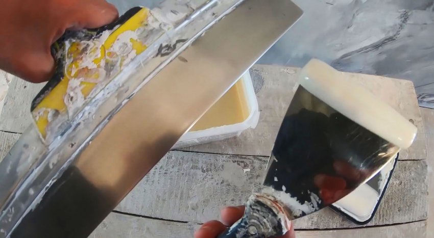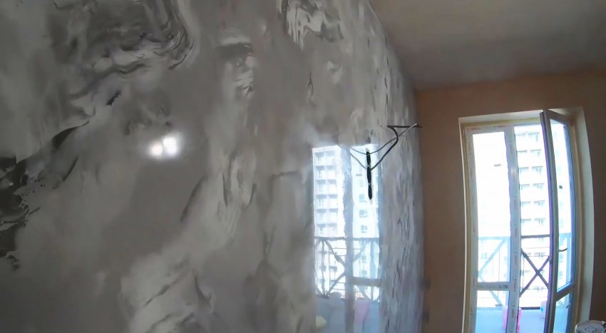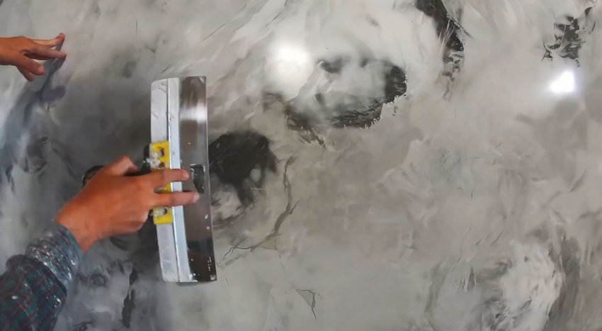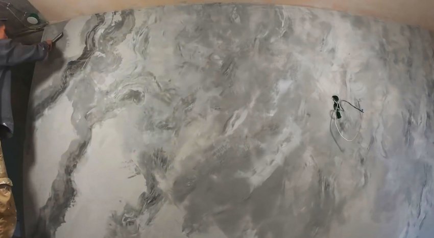 Затем маленьким шпателем 3 состава набираются на большой шпатель. В итоге стоит провести им по стене, и 3 цвета будут смешиваться, давая интересные разводы.