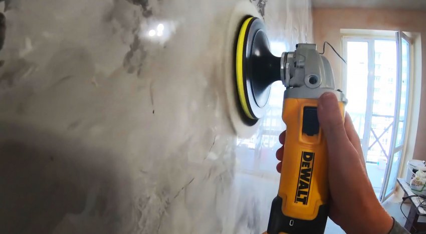 Далее стена полируется болгаркой с наждачным кругом Р1500. Оптимально, чтобы ее скорость была 8-10 тыс. оборотов. Обязательно нужно менять круги пройдя чуть больше 1 кв.м. Если долго работать одним абразивом, то он забивается, и потом начинает царапать стену комками штукатурки. Стена должна заблестеть. Если останутся матовые участки, то они такими будут даже под воском.