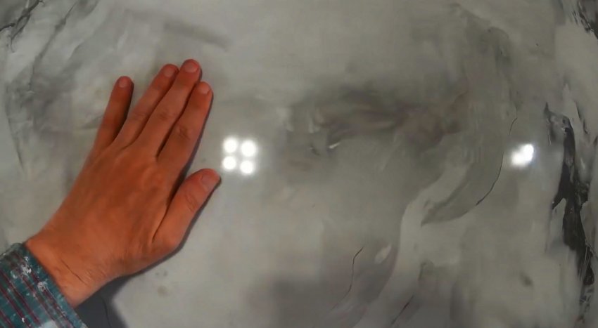 При высыхании штукатурка светлеет, поэтому первоначальный контраст сойдет. Третьим слоем наносится еще более темная штукатурка, чтобы делать резкие переходы между разводами, как на настоящем мраморе. Если местами слой получился толстым, то лишнее снимается шкуркой до того, как вести по нему свежим составом.