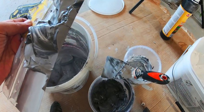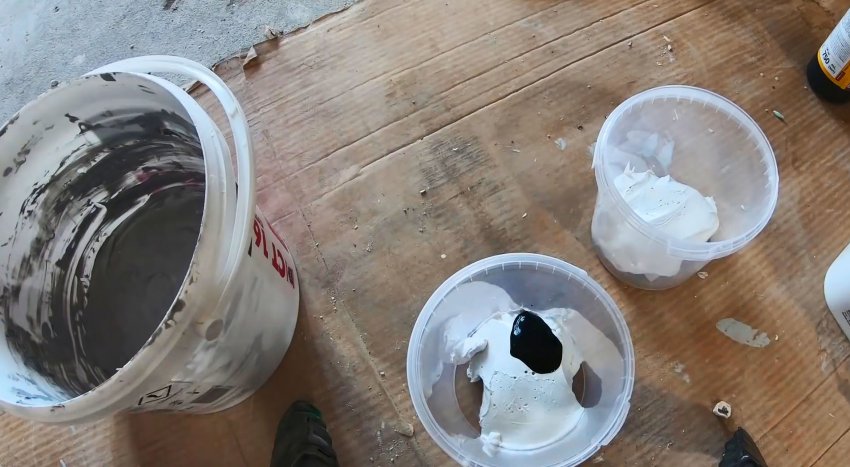 После высыхания краски нужно набрать в 3 небольшие емкости по небольшой порции венецианской штукатурки. В них добавляться черный краситель, и составы перемешиваются. В каждый нужно вливать разное количество капель колера, чтобы оттенки штукатурки в итоге отличались.