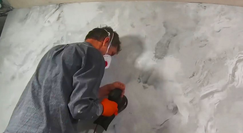 Штукатурка очень быстро сохнет. Поэтому уже через 20 мин можно ее шлифовать. Для этого используется шкурка Р500. Шлифовкой следует не только убирать шероховатости, но и стирать плохо получившийся рисунок. Можно проявлять нижние слои, на которых это место вышло более естественным. Задача шлифовки как ластиком убрать то, что не нравится, и проявить более удачный нижний слой, где это нужно. В итоге они естественно соединяться в одну картинку.