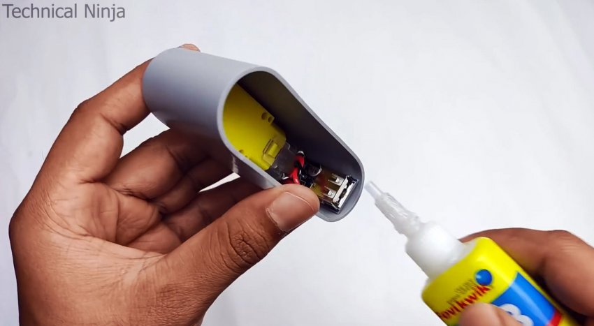 Нужно, чтобы его USB порт был направлен на открытый торец корпуса. Во второй заглушке нужно прорезать окно под USB порт. Затем она также вклеивается.