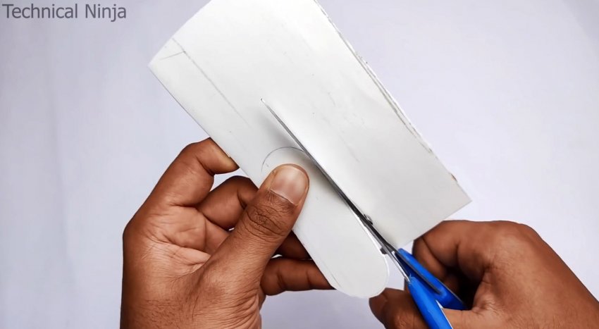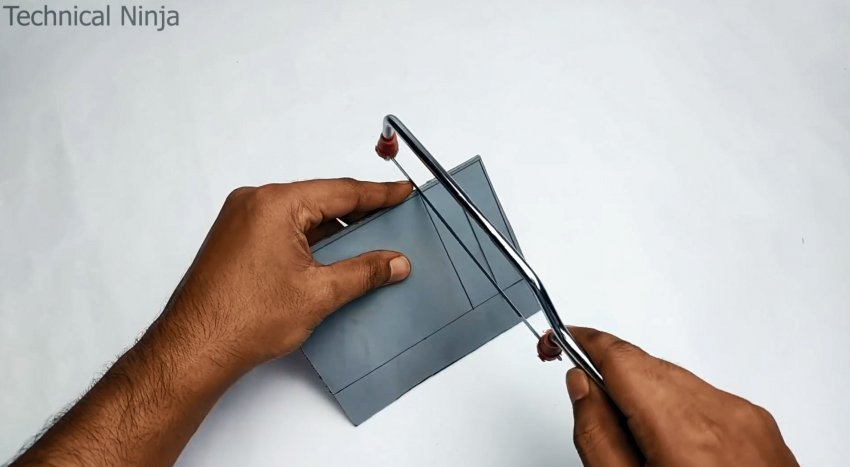 Из листового пластика вырезается 2 полоски для изготовления рычага вращения редуктора. Они склеиваются между собой, затем их углы скругляются. По краям рычага делаются отверстия. Одно под форму вала редуктора, а второе под саморез.