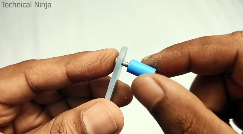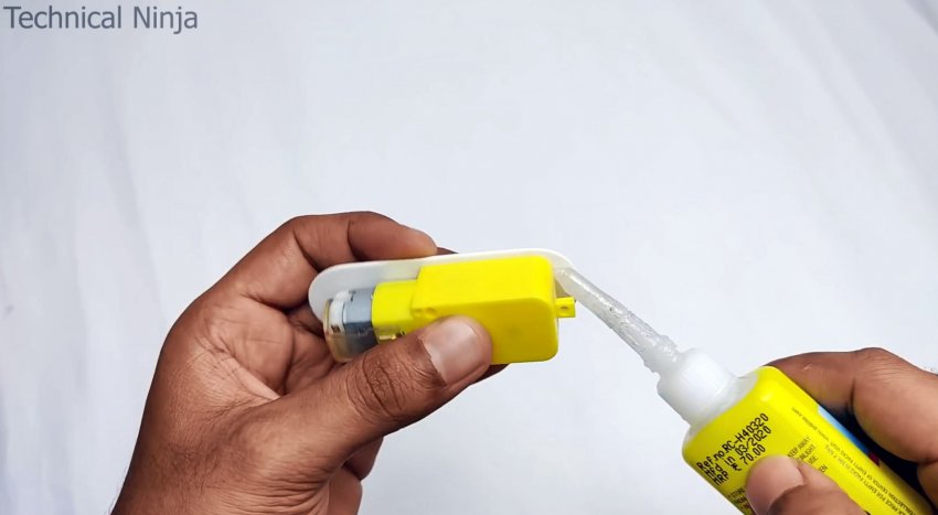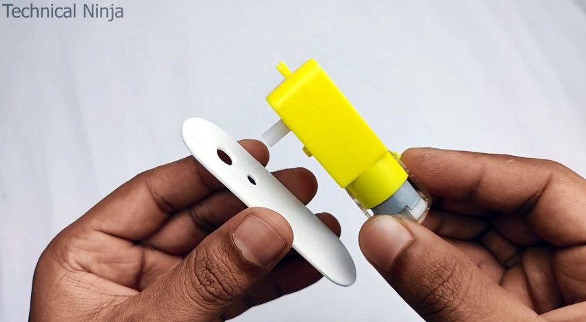 В одной заглушке проделывается отверстие под вал редуктора. После этого мотор к ней приклеивается. Вал соответственно выводится на обратную сторону через отверстие.