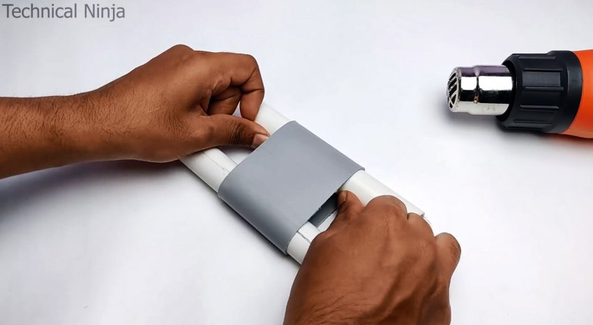 В него вставляются 2 трубки диаметром 25 мм, и заготовка с их помощью растягивается. Нужно ее зафиксировать в таком положении на минуту, пока пластик не застынет.