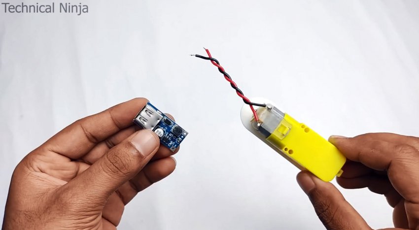 Теперь при вращении за ручку зарядного устройства производится электричество, которое с помощью модуля повышается до 5 В.