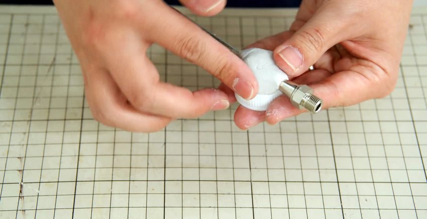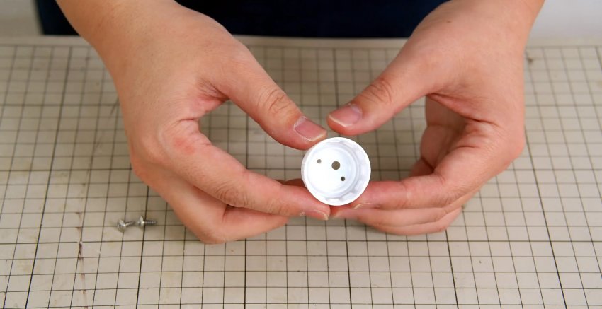Далее нужно просверлить крышку от ПЭТ бутылки сверлом 3 мм. Отверстие делается с небольшим смещением от центра. По краям крышки делается 2 отверстия сверлом 1 мм.
