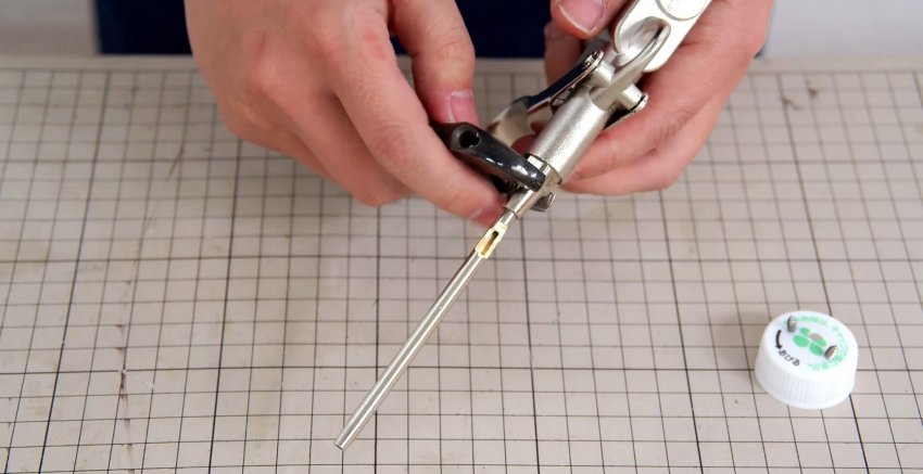 Необходимо проточить стенку трубки продувочного пистолета сверху, ближе к его корпусу. Ширина полученного отверстия должна получиться примерно 6-8 мм.