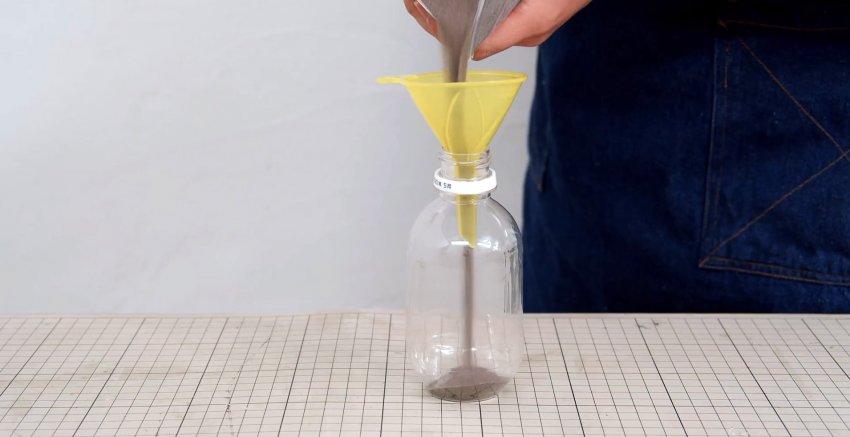 Теперь в небольшую ПЭТ бутылку набирается сухой просеянный песок, и она заворачивается в крышку на пистолете.