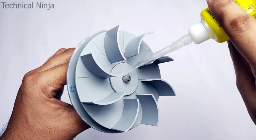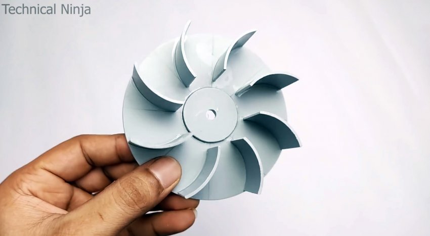 Из оргстекла вырезается защита для крыльчатки с отверстием для затягивания воздуха в центре. Ее нужно вклеить в корпус перед лопастями, чтобы она к ним не касалась.