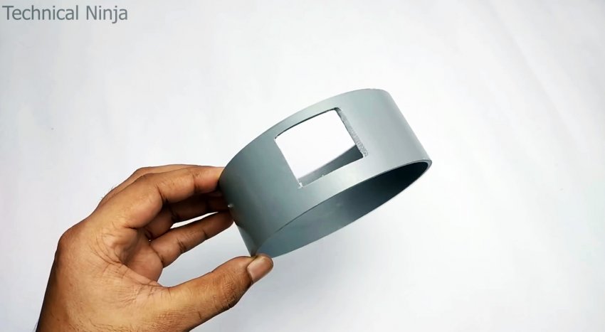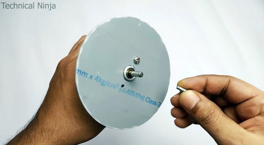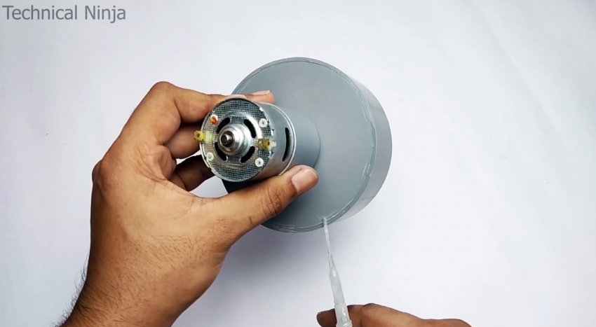 На сам двигатель натягивается кожух, сделанный из отрезка трубы 50 мм. В нем нужно проделать вентиляционные отверстия. Открытый край кожуха заклеивается заглушкой с отверстием.