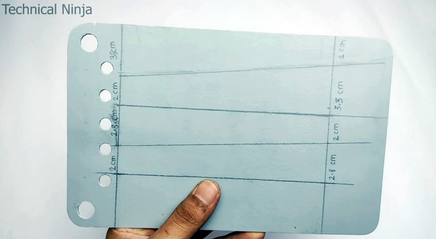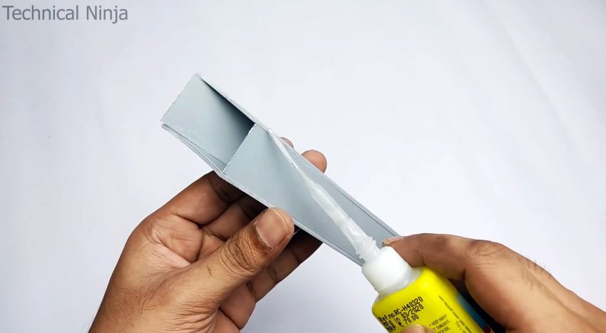 Чтобы сделать патрубок для направленного выхода воздуха с воздуходувки, потребуется разровнять в пластину еще отрезок трубы, и сделать на нем разметку как на фото. Полученные 4 полосы склеиваются в профильную трубу. Далее она приклеивается на корпус поверх прорезанного окна.