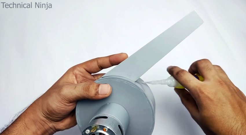 Далее в заготовке под корпус воздуходувки прорезается квадратное окно для выдува воздуха. После этого в нее вклеивается заглушка с мотором и крыльчаткой.