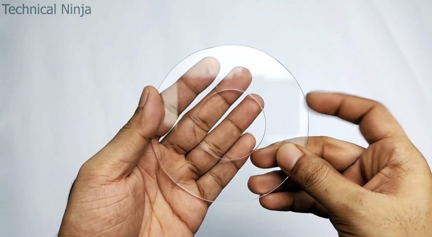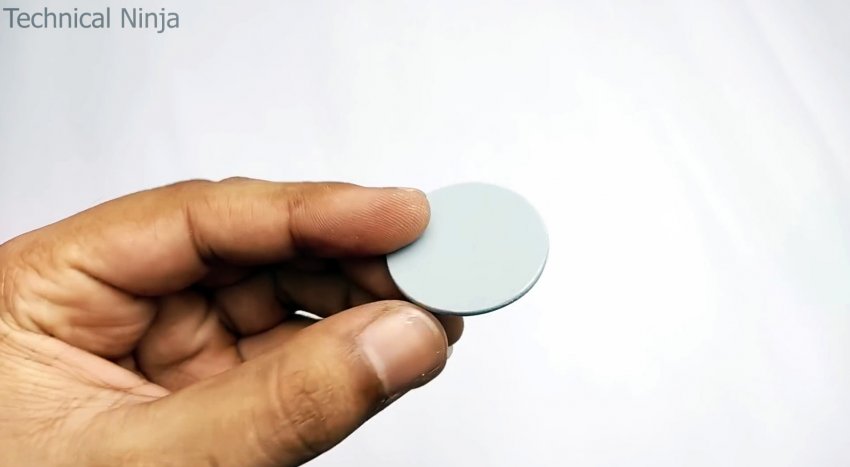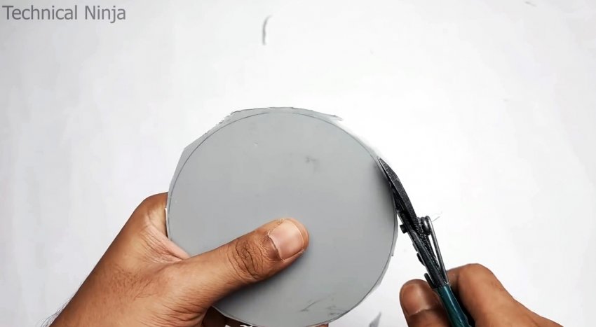 Центр заготовки просвечивается под вал двигателя, и затем на прорисованный круг вклеивается диск диаметром 40 мм. Эта накладка также сверлится.