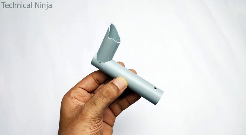 Из двух отрезков пластиковой трубы диаметром 20 мм склеивается Г-образная ручка. В месте стыка в длинной трубке должно быть сделано отверстие для ввода кабеля. Край короткой обрезается наискосок, чтобы стыковаться с корпусом воздуходувки.
