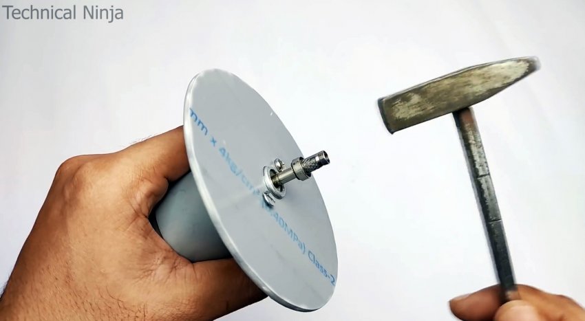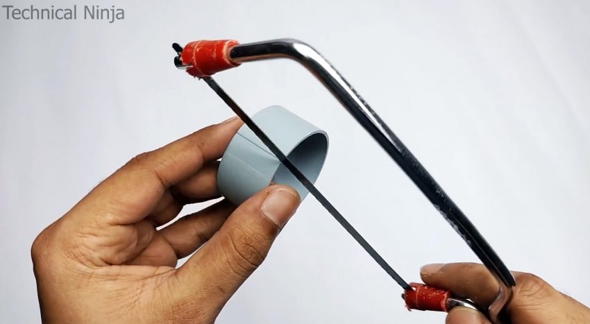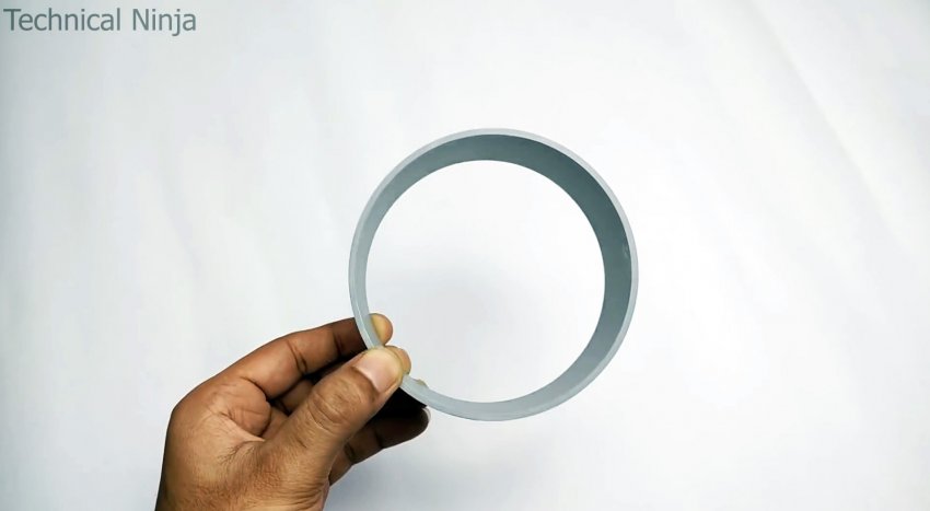 Затем требуется сделать для него заглушку. Для этого нужно распустить вдоль кусок такой же трубы, и разогрев пластик феном разровнять ее, прижав между двумя плоскостями до остывания. С полученной пластинки вырезается диск, который впритирку входит внутрь ранее отпиленного кольца.