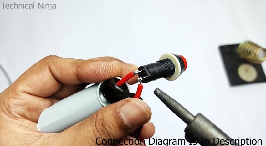 В конец длинного края ручки вклеивается заглушка с установленным разъемом питания. К нему заранее припаиваются провода. Их нужно проложить до второго конца этой трубки. Там они спаиваются с кнопочным выключателем, и направляются на выход из ручки. Сам выключатель вклеивается аналогично разъему.
