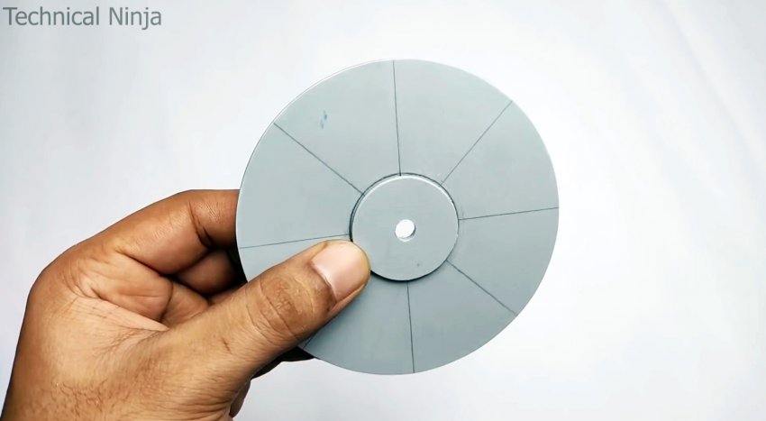 Чтобы сделать крыльчатку, необходимо аналогично вырезать из распрямленной в пластину трубы диск. Только он делается на 6-10 мм меньшего диаметра, чтобы при размещении внутри не цеплять стенки кольца. На диске отмечается центр, и прорисовывается круг диаметром 40 мм. Затем он разбивается на 8 равных секторов.