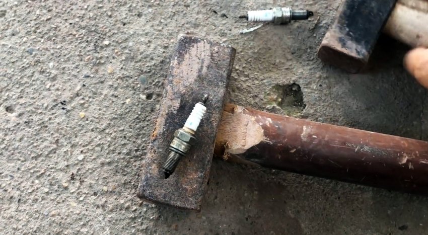 Для резки стекла нужно получить осколок изолятора свечи зажигания. Она может быть абсолютно в любом состоянии, ее работоспособность не имеет значения. Достаточно ударить по изолятору молотком, и он разлетится на части. Следует выбрать осколок удобного размера с острой кромкой.